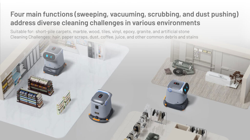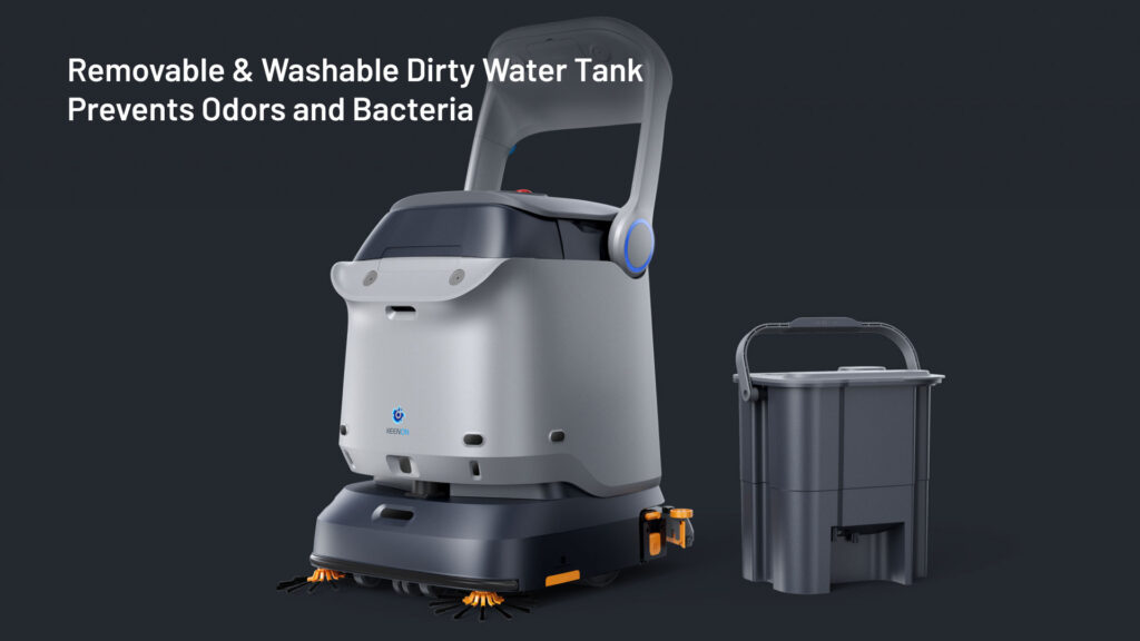 The KLEENBOT C40 integrates 5 cleaning modes: sweeping, vacuuming, scrubbing, dust mopping, and wet mopping. It's a complete solution for maintaining pristine floors in any commercial space.