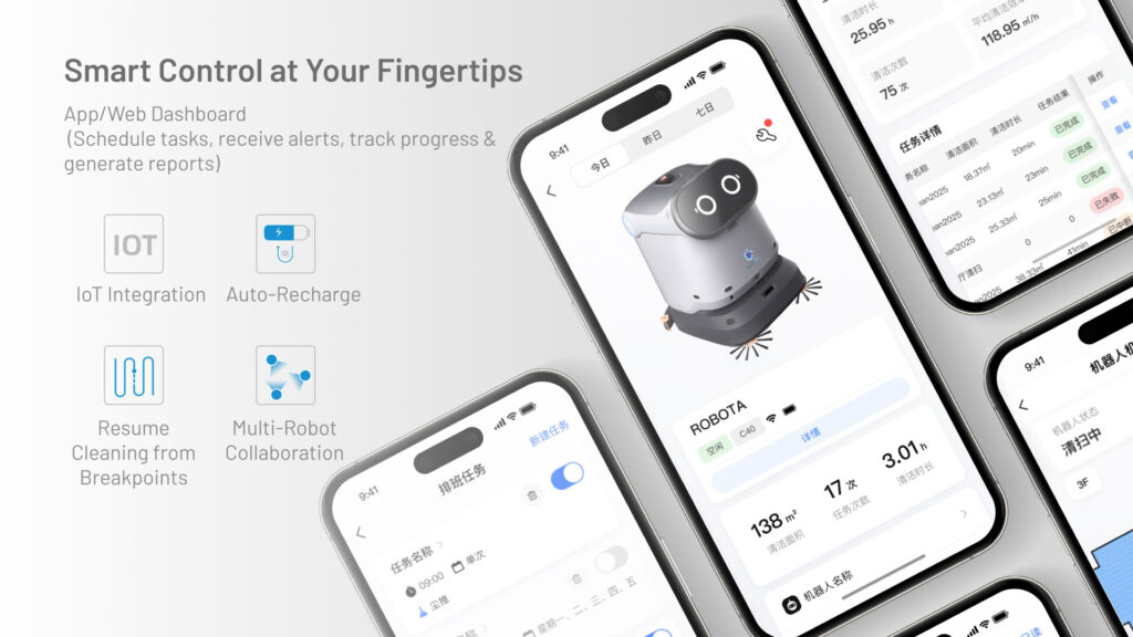 Manage your cleaning fleet from anywhere with the KEENON Cloud platform. Schedule tasks, monitor real-time progress, and receive detailed cleaning reports on your mobile device.